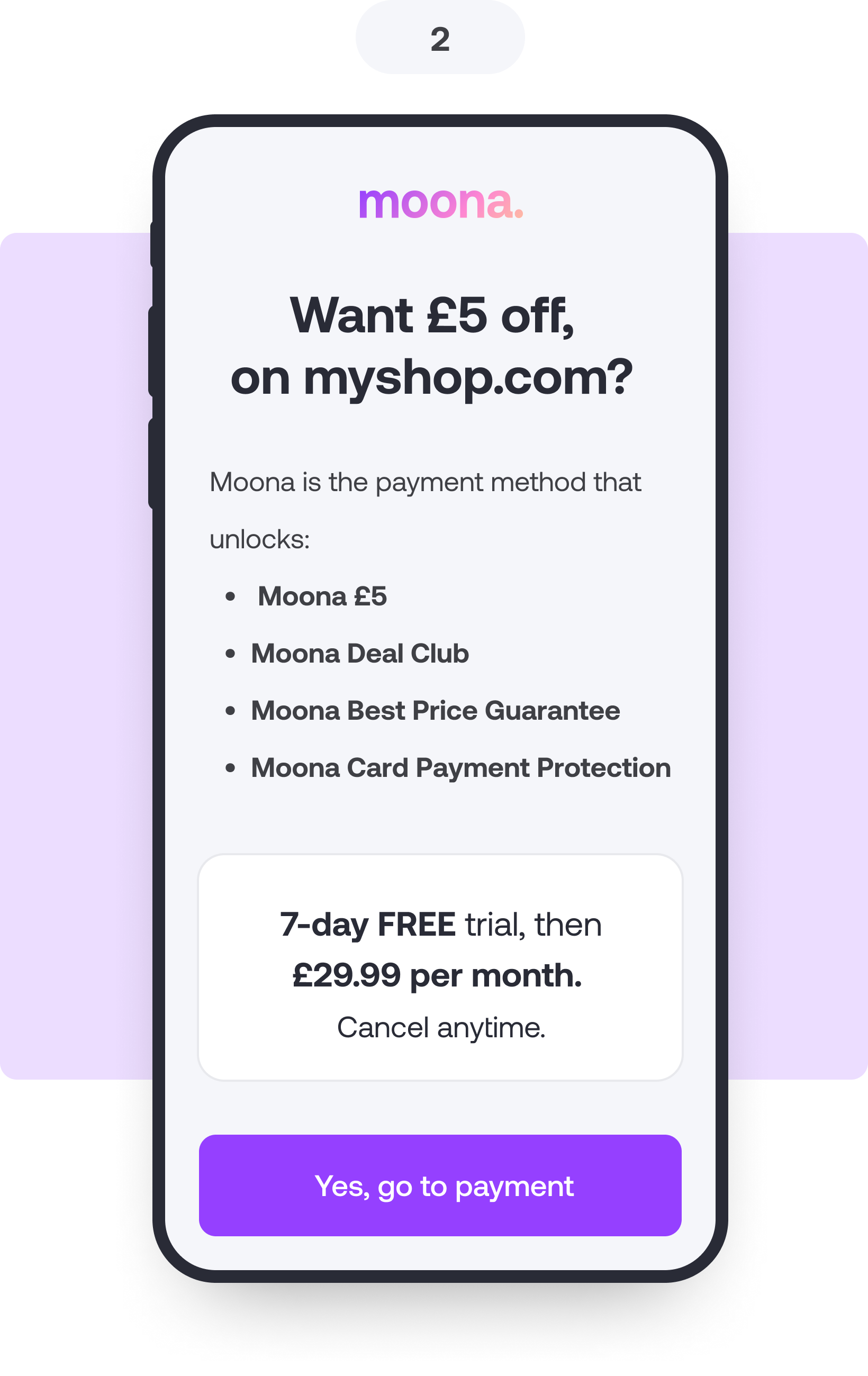 Shoppers choose to become a Moona member. After a 7-day free trial period, they pay £29.99 per month.